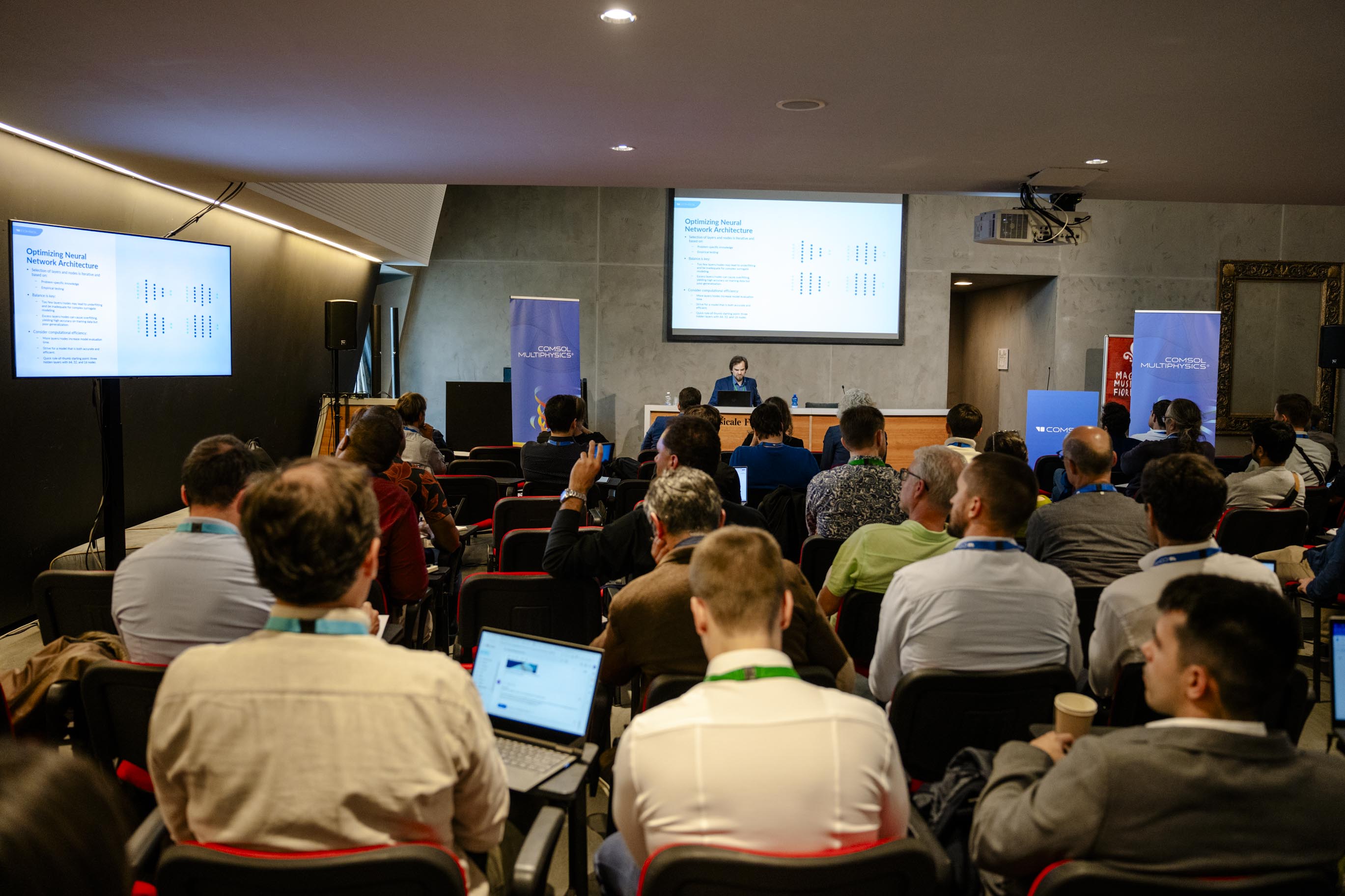 Another highlight of the COMSOL Conference 2024 Florence was the invited talk sessions, which were dedicated to specific industries and areas of physics and featured presentations by invited authors. During these sessions, four speakers each delivered 10-minute slideshow presentations on how they are using modeling and simulation. With a total of 48 invited talks, attendees were able to see how simulation is being used for applications such as noise attenuation, machine learning, and spacecraft device development, to name just a few.
